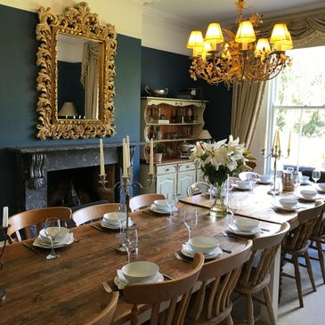 The lounge offers views over the garden through the large Georgian windows with an open fire for cosy relaxation and the large grand dining room is perfect for a celebration dinner.